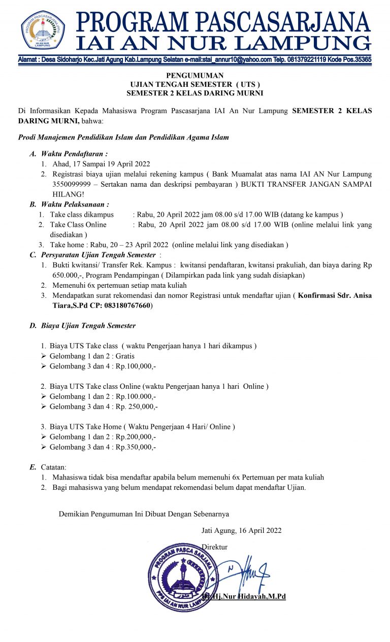 Pendaftaran Ujian Tengah Semester (UTS) Semester 3 Program Pendampingan ⏱ 06/04/2022 Di Informasikan Kepada Mahasiswa Program Pascasarjana IAI An Nur Lampung semester 3 Kelas daring ( Program Pendampingan ), bahwa: Prodi...