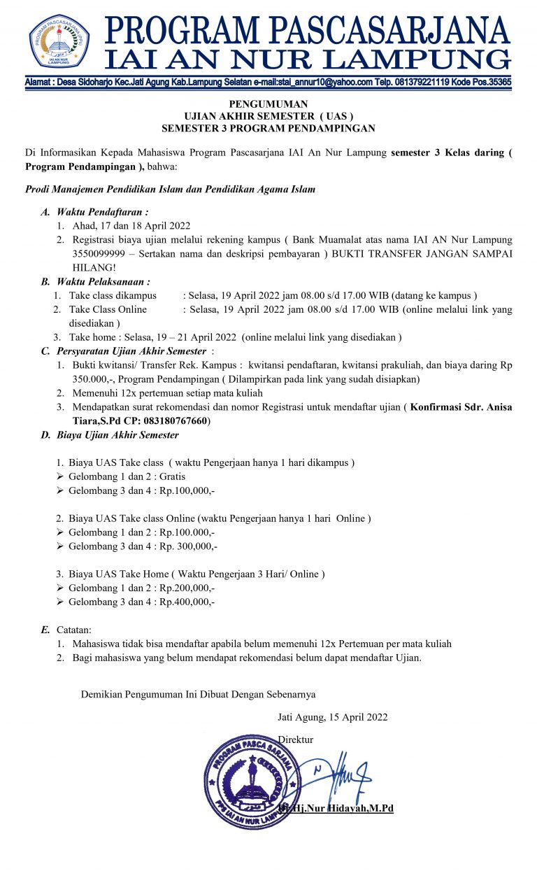 Pengumuman Ujian Akhir Semester Pascasarjana ⏱ 14/03/2022 Di Informasikan Kepada Mahasiswa Program Pascasarjana IAI An Nur Lampung semester 2 Kelas daring ( Program Pendampingan ), bahwa: Prodi...
