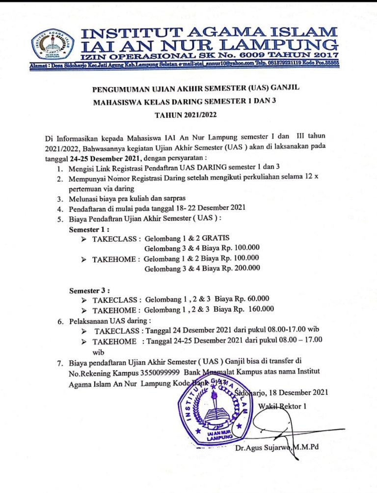 Pengumuman Ujian Akhir Semester Kelas Daring (S2) ⏱ 17/12/2021 Di Informasikan Kepada Mahasiswa Program Pascasarjana IAI An Nur Lampung SEMESTER 1 KELAS DARING, bahwa: Prodi Manajemen Pendidikan Islam dan...