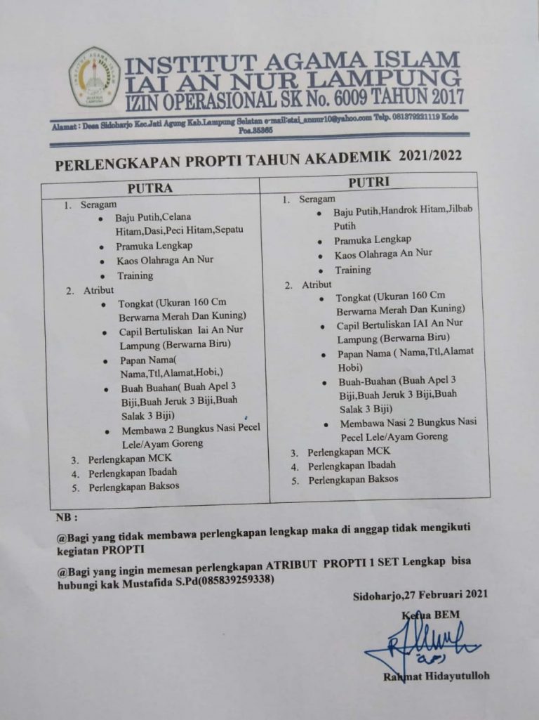 Pengumuman: Perlengkapan Propti Tahun Akademik 2021/2022