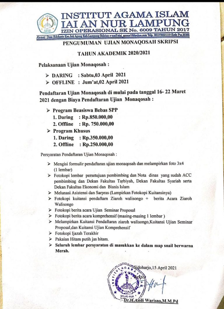 PENGUMUMAN Pembekalan Matrikulasi Dan Penjelasan Proses Perkuliahan Program Pascasarjana Iai An Nur Lampung Akan Dilaksanakan Pada Sabtu, 13 Maret 2021...