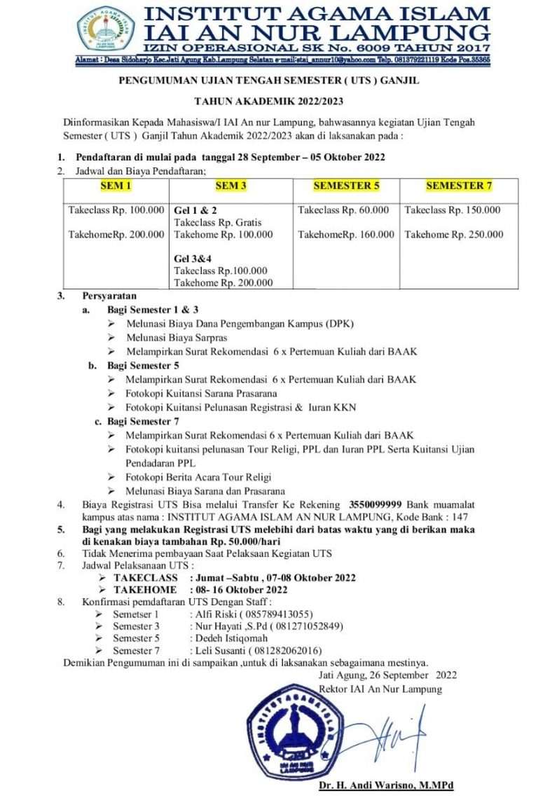 Pengumuman Ujian Tengah Semester (UTS) S1 Ganjil Kelas Daring Tahun Akademik 2022/2023