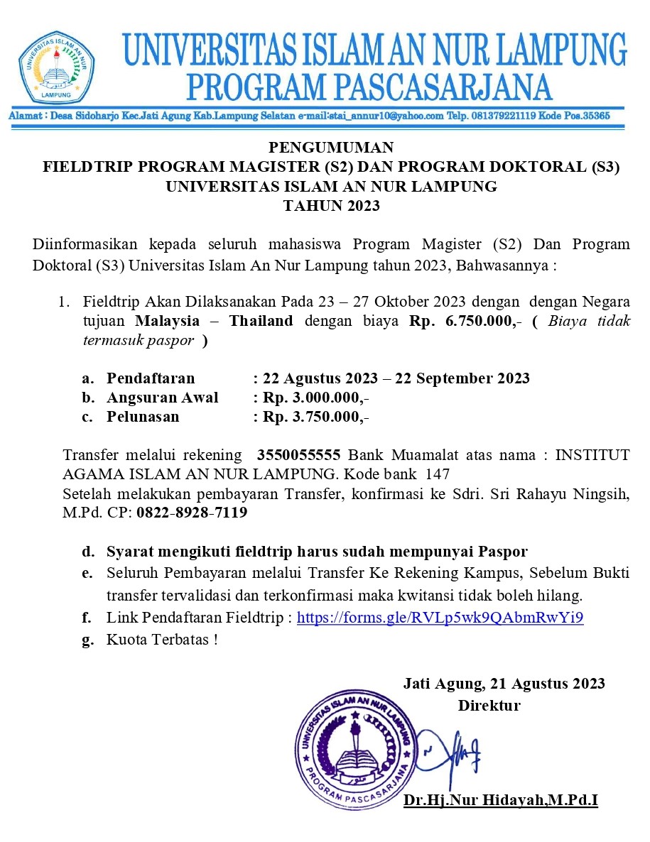 Diinformasikan kepada Mahasiswa Pascasarjana Magister dan Program Doktoral Universitas Islam An Nur Lampung, Bahwa kampus akan mengadakan fieldtrip yaitu Kunjungan wisata yang tujuannya untuk menunjang pengetahuan mahasiswa melalui pembelajaran di luar kelas, dengan mendatangi beberapa destinasi yaitu Ke negara Malaysia dan Thailand dengan rincian sebagai berikut ini