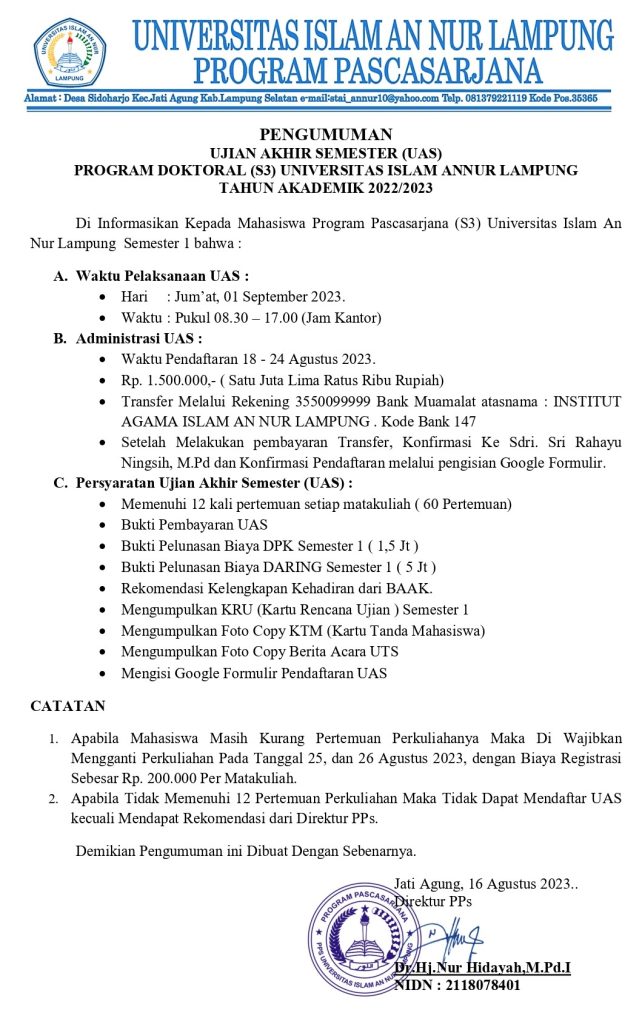 Formulir ini di peruntukkan pada mahasiswa semester I Program Doktoral S3 Universitas Islam Annur Lampung.